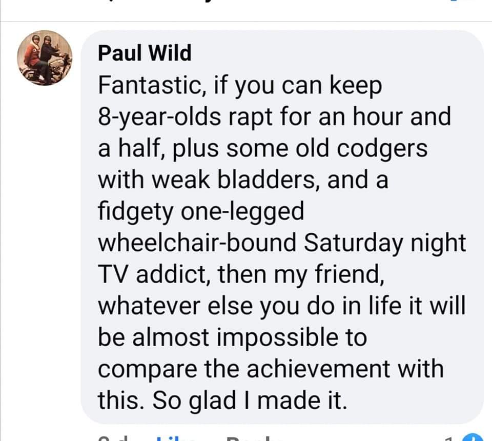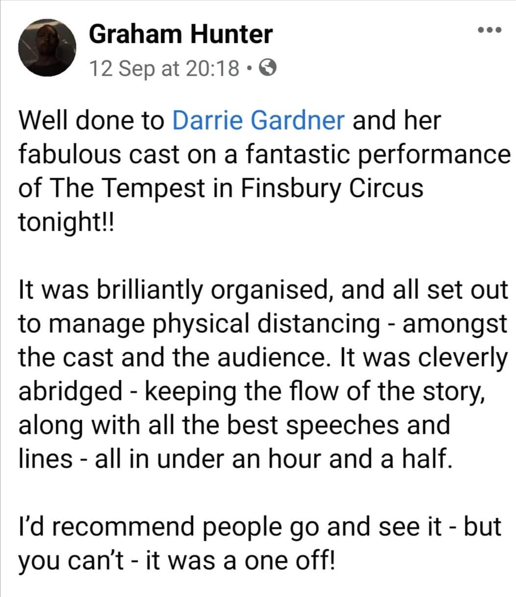 “Just wanted to say how fantastic I thought the reading was on Friday. So much more than a reading, the attention to detail was amazing for the given time, especially the costume, all the effort the cast had gone to understand their characters blew me away. It was very emotional and I am full of admiration for what you are doing. It was totally absorbing and cathartic… absolutely can see this at the National Theatre…”